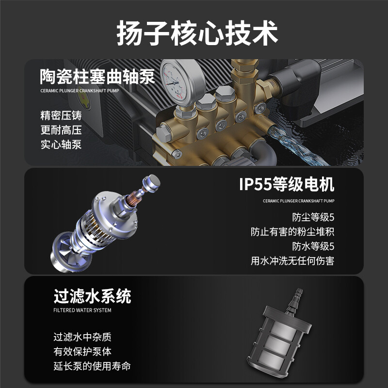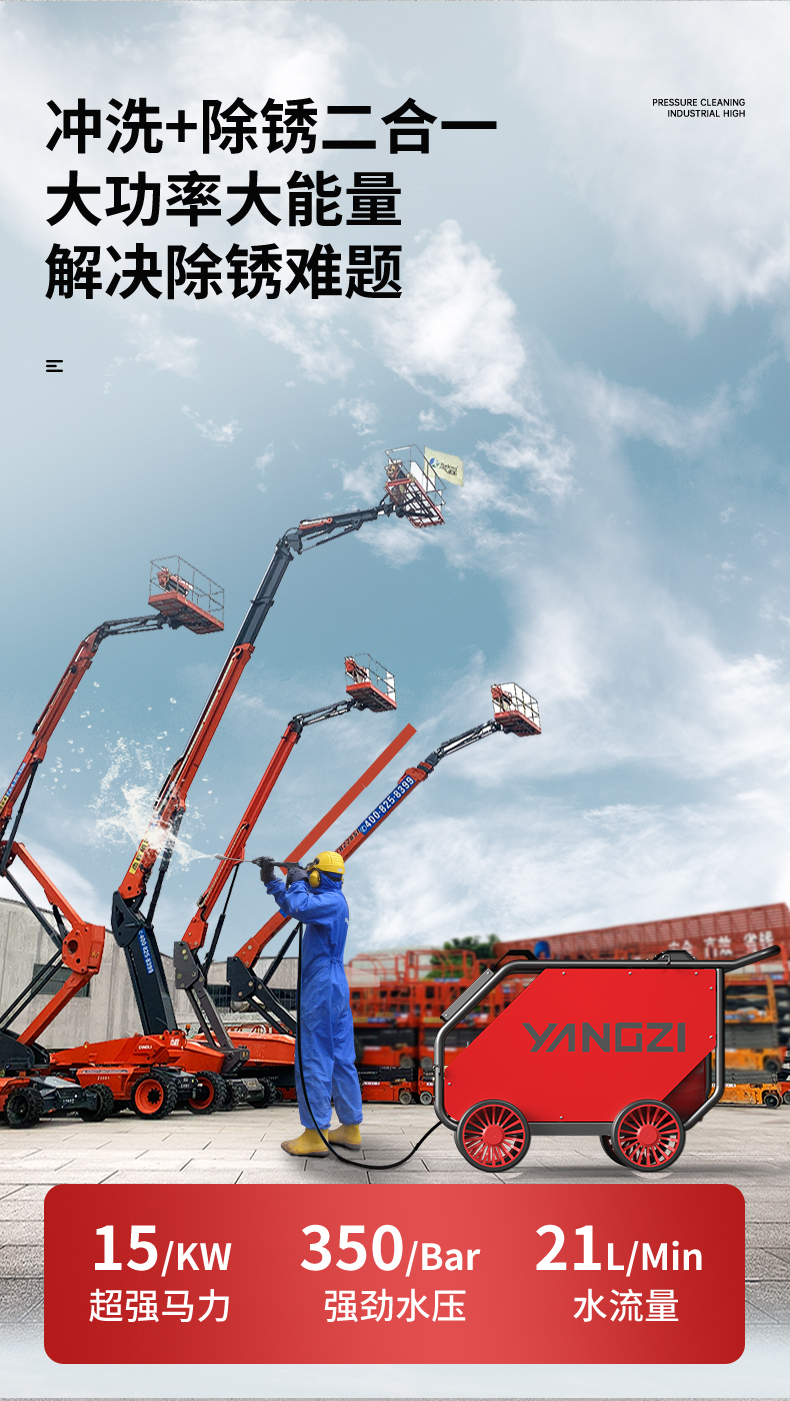 揚子YZ35-21E電動高壓清洗機廣泛應用物業小區、工業化、城市、酒店后廚等污水管道疏通清洗,沖洗+除銹二合一大功率大能量解決除銹難題
