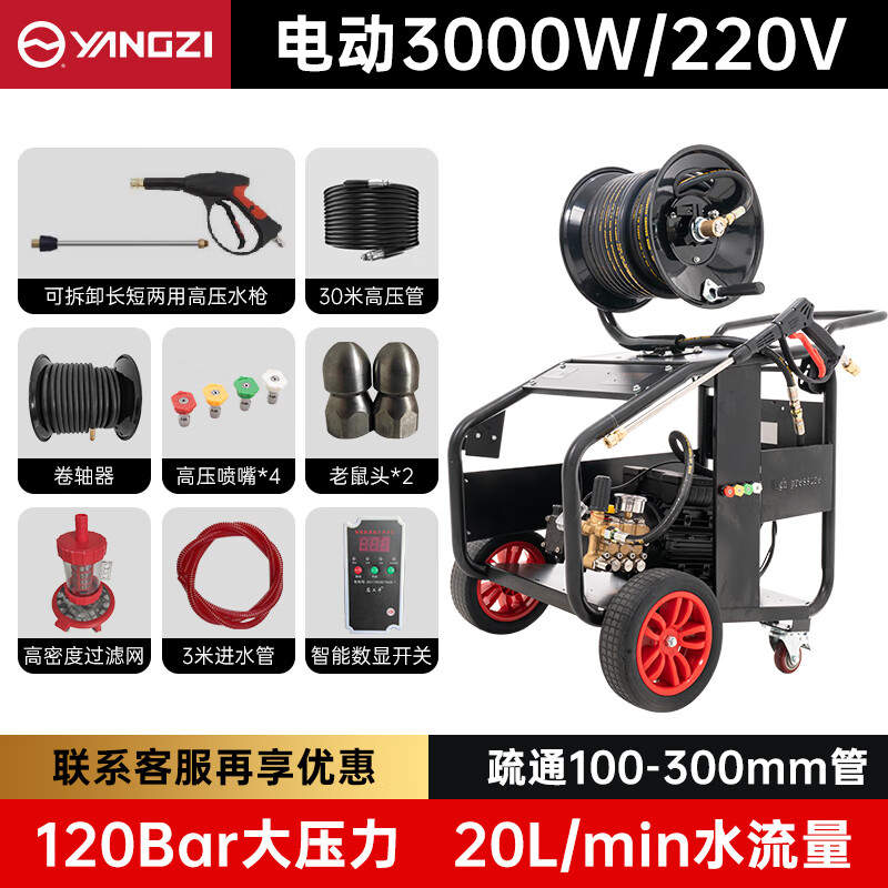 管道疏通機就選揚子,一臺機器兩種用處,配備3中型號噴頭,適用于多種場景應(yīng)用,動力強水流大,通暢無阻拐彎無壓力