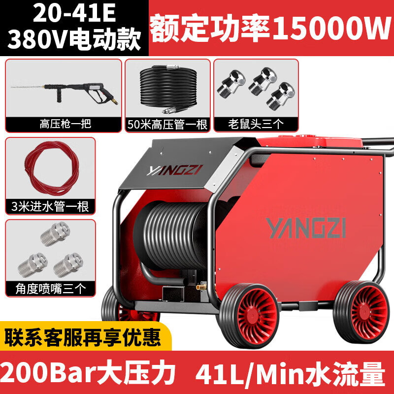 揚子YZ-20-41E電動管道疏通機疏通+清洗,一機在手清潔無憂;380V工業電使用作業有保障,2種接頭可選配針對不同沖洗種類,不同環境不同選擇。