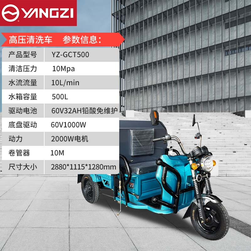 揚子YZ-GCT500純電動高壓清洗車,市政環衛、綠化灑水、道路降塵移動沖洗一步到位,500L大容量水箱持久清洗無須反復加水。