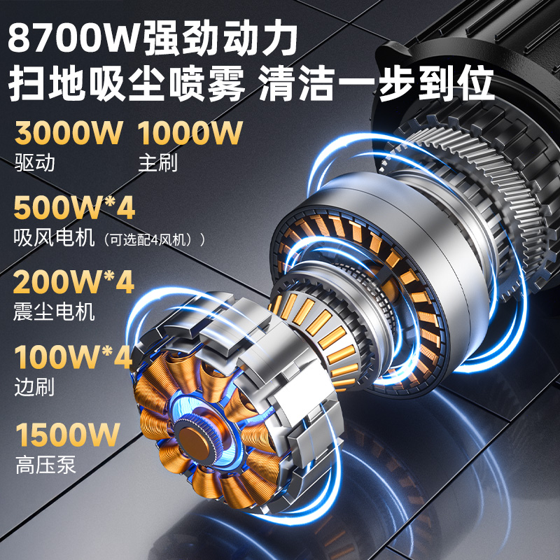 掃吸灑三合一,24000㎡/h高效清掃,智能操控清潔,48V/150Ah電池容量,智能照明大燈,雙碟剎制動