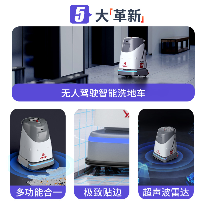 揚子YZ-SC50無人駕駛洗地機AI智能識別、全自動作業,洗地、塵推、掃地等多種功能可選,智能清潔可自動充電、排水、加水、避障等。
